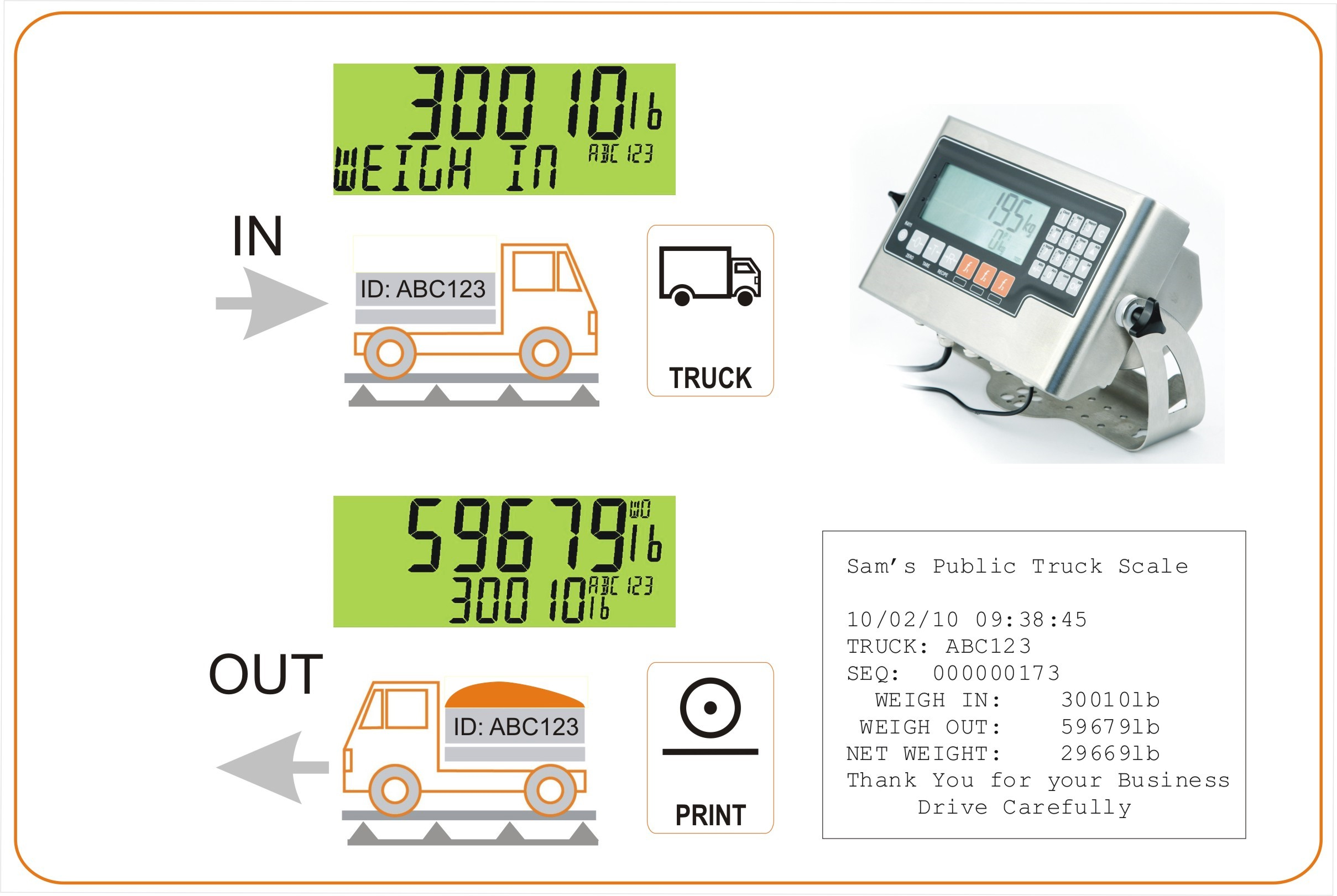 - Two pass weighing with a weigh in followed by a weigh out. The ticket will show time/date weigh-in, weigh-out and net weights.